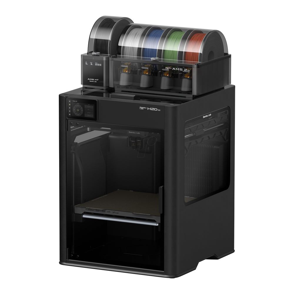 BambuLab H2D Pro AMS Combo, çift nozzle, geniş hacim, yüksek hız ve otomatik çoklu filament sistemi ile profesyonel seviyede, çok malzemeli ve yüksek performanslı 3D baskı deneyimi sunan bir masaüstü yazıcıdır.