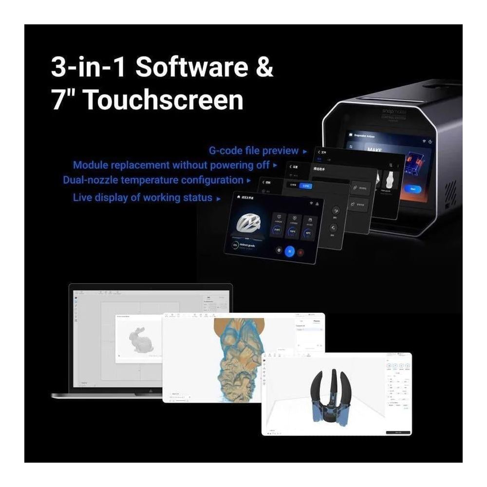 Hızlı değiştirilebilir tasarım Hızlı değişim sistemi sayesinde baskı, lazer kesim, gravür ve CNC işleme arasında anında geçiş yapabilirsiniz!